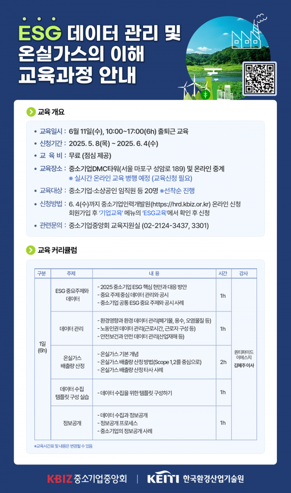 ㅇ 교육내용 : 중소기업 공통 ESG 중요주제와 공시 사례, 환경 데이터관리(용수, 폐기물 등), 온실가스 배출량 산정, 정보공개 프로세스 등